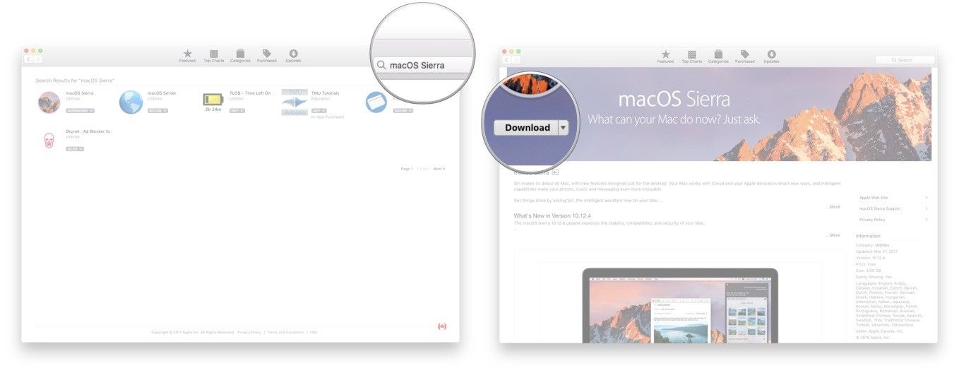- Скачать macOS Сьерра — или введите «macOS Sierra» в строку поиска вверху справа, если эта ссылка не работает для вас.