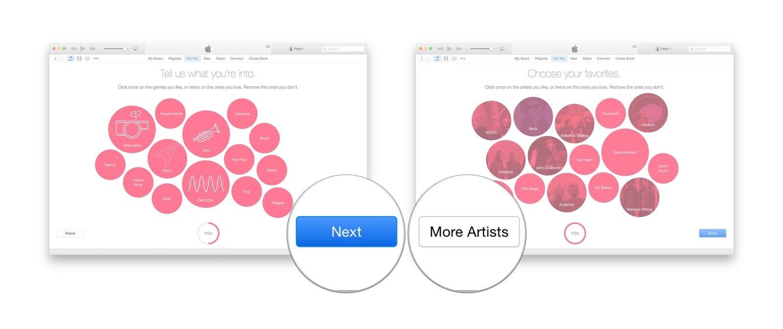 Когда вы впервые регистрируетесь в Apple Music, вас попросят коснуться серии пузырей, представляющих жанры и исполнителей; Дважды нажмите на пузырек, чтобы полюбить нужный вариант, нажмите один раз, чтобы просто «полюбить» его, и нажмите и удерживайте, чтобы удалить параметр из своих предпочтений.