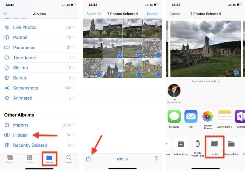 Обратите внимание, что изображения, которые вы хотите скрыть из библиотеки фотографий, хранятся в альбоме скрытый, который живет в Альбомы Вкладка.