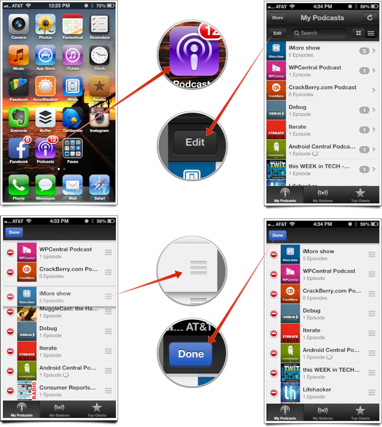 - Теперь вы можете перетаскивать подкасты в любом порядке. Просто нажмите Готово когда вы закончите сортировку.