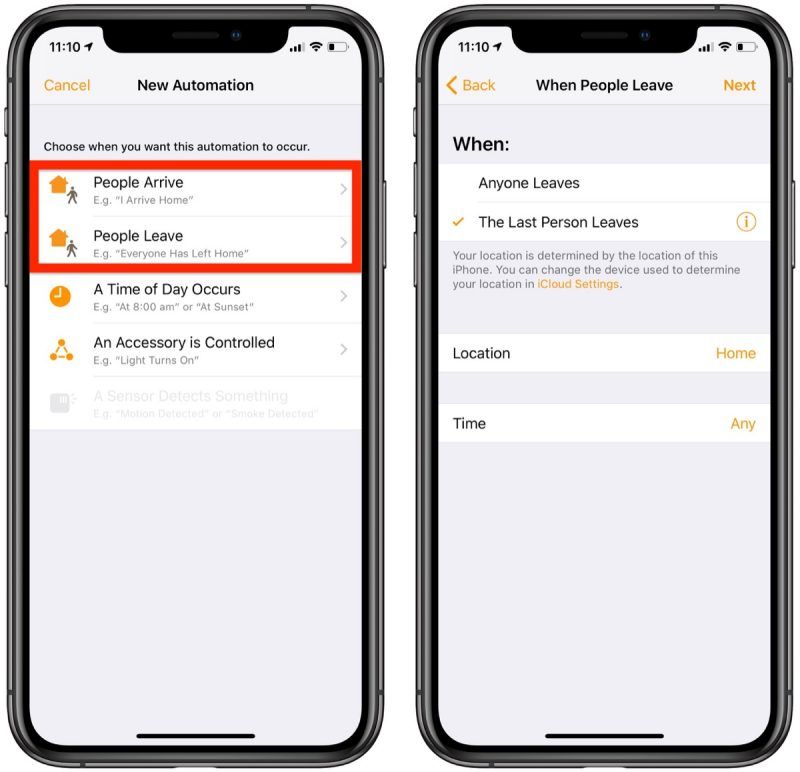 Автоматизация, основанная на том, когда человек покидает дом или прибывает в него, использует геозону, основанную на местоположении, для включения автоматизации. Когда ваш iPhone обнаружит, что ваше местоположение находится в вашем доме, он запустит автоматизацию.