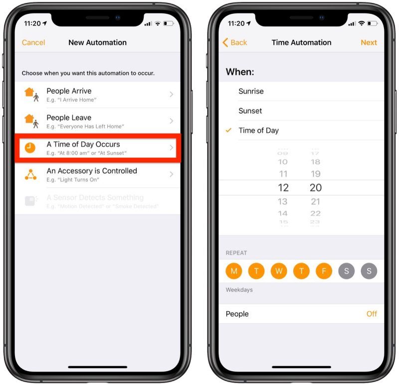 - Выберите время и день недели из экранных настроек. Вы также можете нажать люди чтобы автоматизация происходила в определенное время, когда кто-то дома.