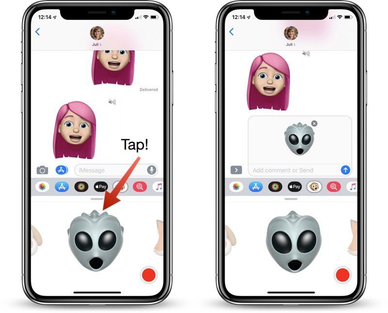 Ваши Memoji и Animoji также можно использовать в качестве стикеров, если вы просто хотите отправить быструю реакцию на фотографию, но не полное видео. Для этого сделайте нужное лицо, а затем нажмите на сам анимодзи, а не на кнопку записи, чтобы создать небольшой скриншот, который можно отправить с помощью синей стрелки вверх.