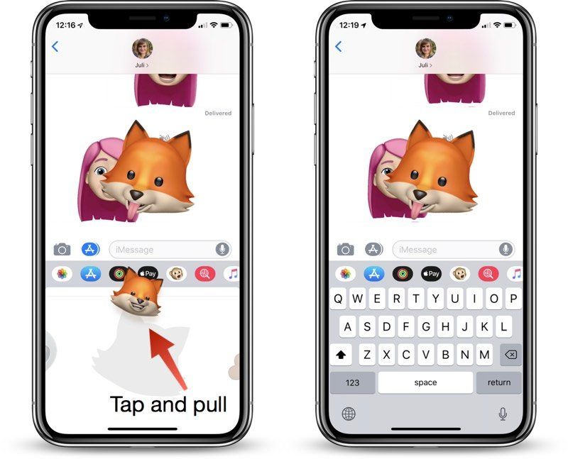 Если вы хотите использовать Animoji или Memoji в качестве наклейки, чтобы отреагировать на другое сообщение или украсить фотографию, нажмите пальцем на Animoji и перетащите его вверх в диалог iMessage.