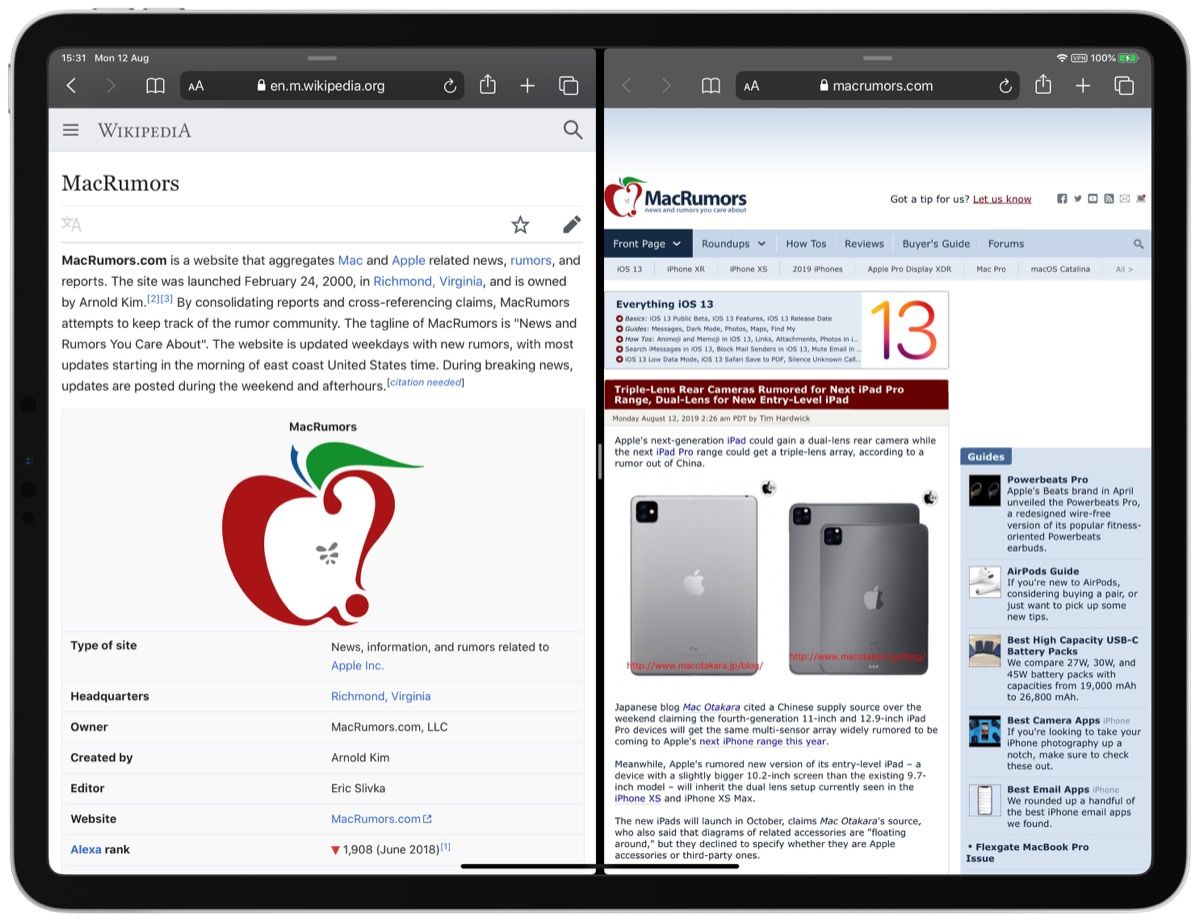 В iPadOS функции многозадачности Apple Split View и Slide Over позволяют использовать одно приложение вместе с другим приложением или одновременно просматривать два документа в одном приложении.