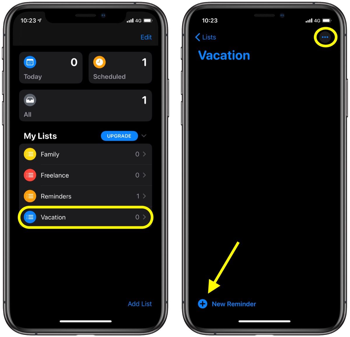 Ваш новый список автоматически появится на главном экране «Напоминания» в разделе «Мои списки». Нажмите на его имя, чтобы начать работу с ним. Открыв новый список, вы можете нажать значок плюса в левом нижнем углу экрана, чтобы добавить первое напоминание. Обратите внимание эллипсис Кнопка в правом верхнем углу.