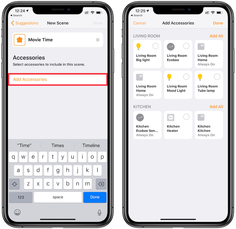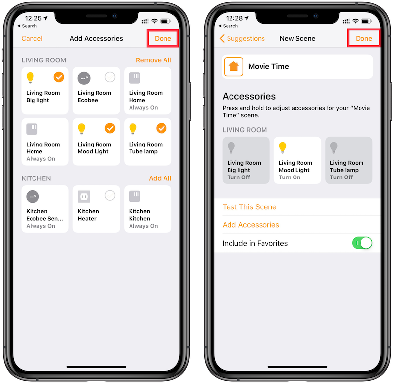 - После того, как вы назвали сцену, нажмите «Добавить аксессуары», чтобы выбрать устройства, которые вы хотите включить при активации сцены, затем нажмите «Готово» в правом верхнем углу.