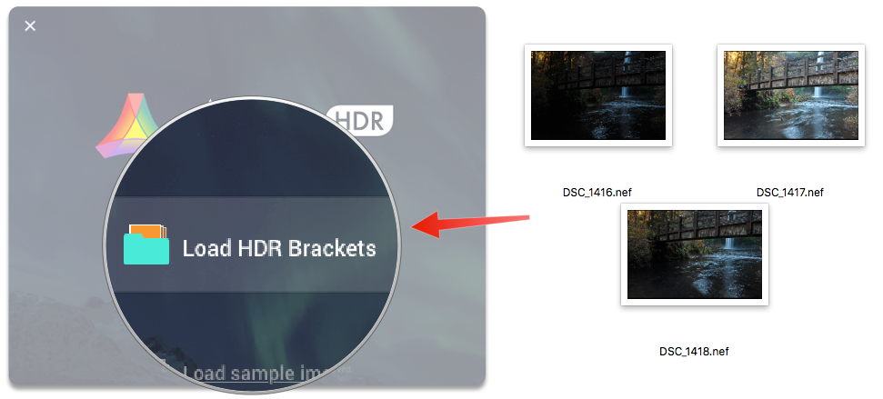 Когда вы впервые открываете Aurora HDR, нажмите Загрузить HDR скобки кнопка, чтобы выбрать изображения, которые вы хотите в стандартном открыто диалоговое окно или перетащите файлы изображений в окно. Вы также можете промокнуть ногами тремя изображениями Трея Рэтклиффа, нажав Загрузить образцы изображений кнопка.