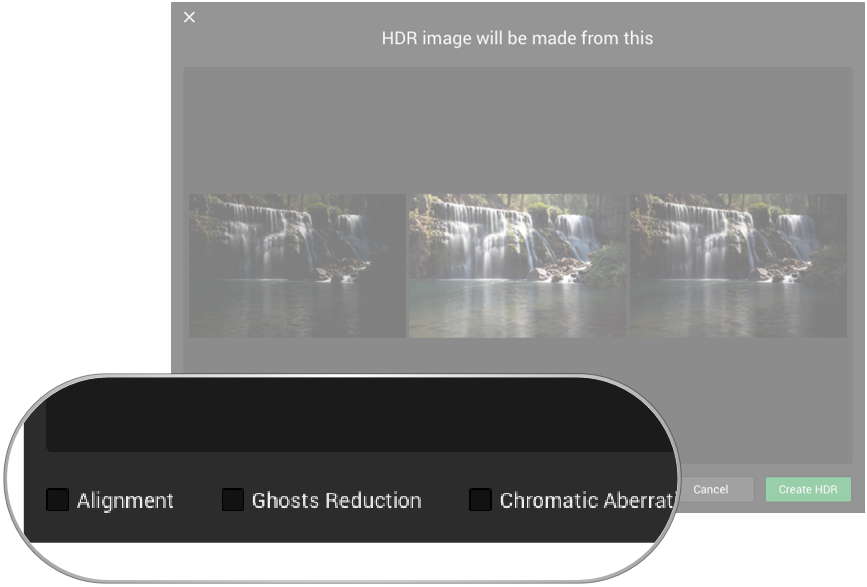 Aurora HDR затем отображает эскизы выбранных вами изображений. Прежде чем нажать Создать HDR Кнопку, тем не менее, обратите внимание на флажки внизу: