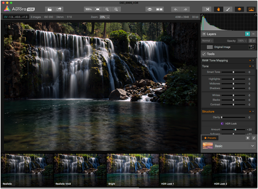 После небольшого ожидания, пока Aurora HDR обрабатывает фотографии, появляется изображение HDR вместе с инструментами справа и предварительными настройками в нижней части экрана.