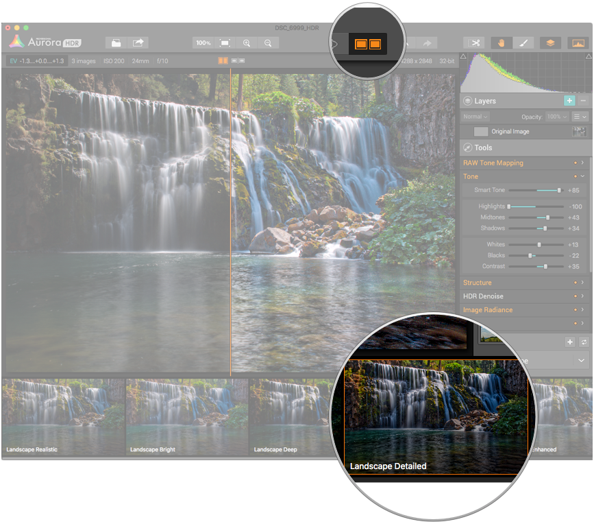 Ряд пресетов проходит вдоль нижней части окна Aurora HDR, показывая предварительный просмотр фотографии с этими настройками. Нажмите один, чтобы применить внешний вид. Нажав на сравнить Кнопка на панели инструментов дает вам разделение до и после предварительного просмотра.