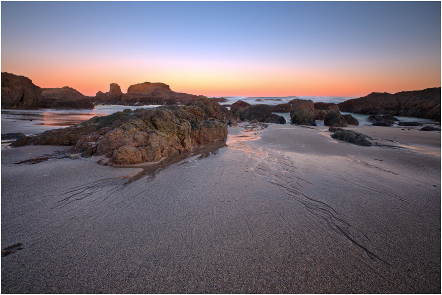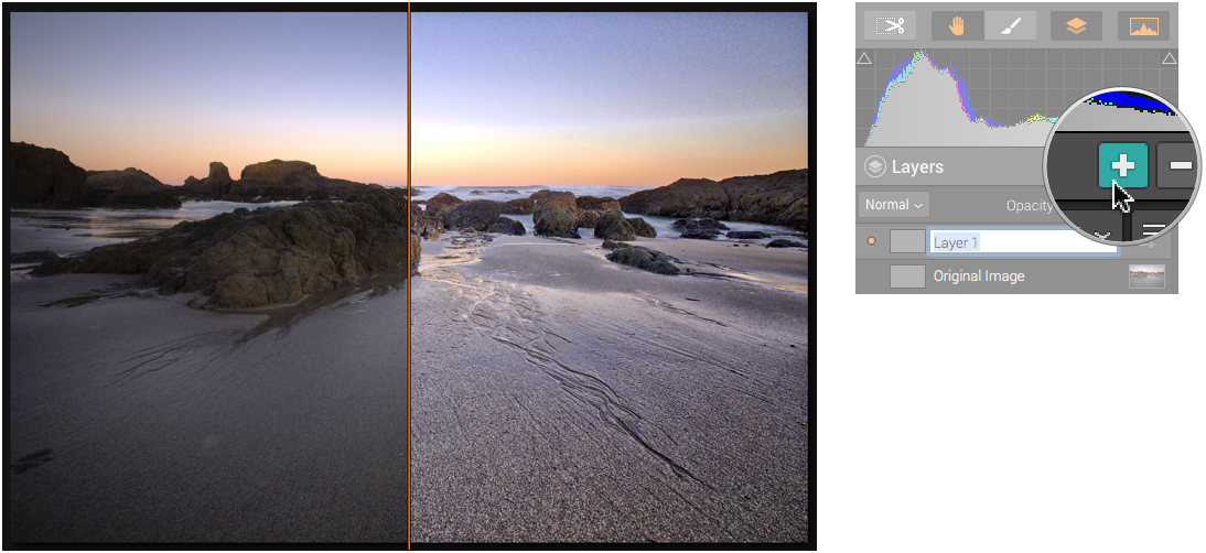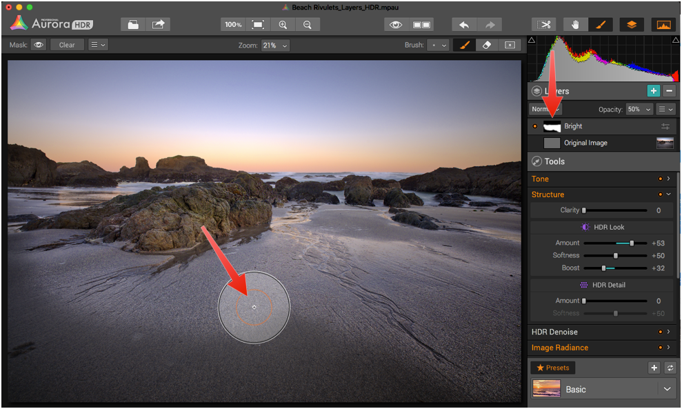 На фото рассвета на пляже ниже, я хочу привлечь внимание к рисунку, высеченному в песке водными ручьями, а также украсить передний план. Применение предустановки Basic Bright дает мне детализацию и больше освещения, но за счет того, что небо становится слишком шумным. Поэтому вместо этого я наложу предустановку на новый слой и сделаю маску, чтобы она применялась только к пляжу.
