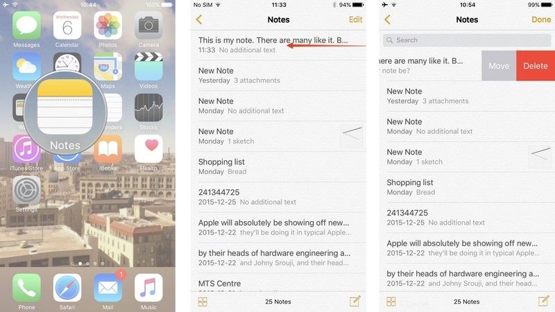 - Коснитесь заголовка заметки в крайнем правом углу и проведите влево, чтобы открыть Кнопка удаления.