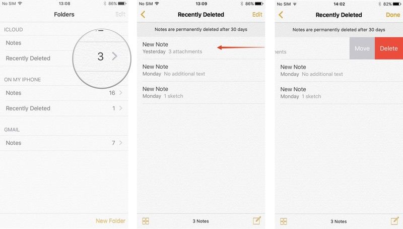 Проведите пальцем влево по недавно удаленной заметке, которую вы хотите восстановить.
