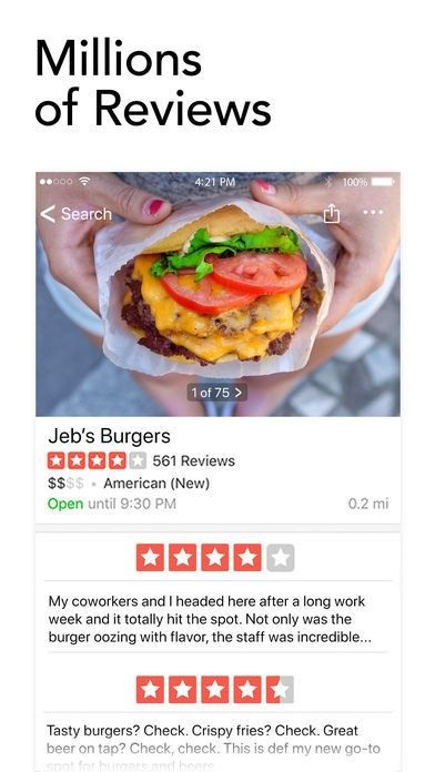 Yelp — самое популярное приложение для обзоров ресторанов, и вы можете найти сводные обзоры почти для каждого ресторана в вашем районе (или, по крайней мере, для тех, которые стоит отметить). Вы также можете получить местоположения, сделать предварительный заказ и отфильтровать все по цене, местоположению, и независимо от того, открыто оно или нет.