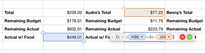Пройдите еще на одну строку вниз, поместите «Actual w / Food» в столбец G и введите эту функцию:
