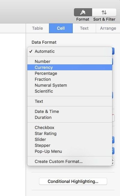 Поднимитесь и нажмите на заголовок столбца — тот, который помечен буквой «B» — чтобы выбрать весь столбец. Затем в правой части окна Numbers нажмите «Ячейка» и в разделе «Формат данных» выберите «Валюта».