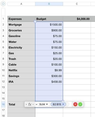 В ячейке B2 напишите «Бюджет». Затем перечислите суммы в долларах для каждого из ваших расходов в столбце А. Некоторые, такие как арендные платежи, должны быть легко предсказуемыми. Для других, таких как коммунальные услуги, предоставьте свою лучшую приблизительную цифру — в идеале, наихудший сценарий с самой большой суммой, которую вы можете себе представить, оплачивая эти расходы в течение определенного месяца.