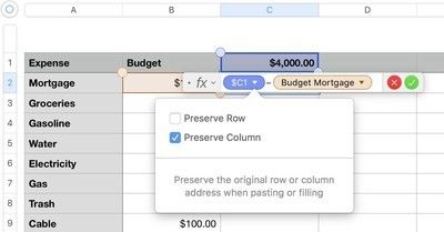 Нажмите на маленькую стрелку рядом с $ F1 в функции поменяйте «Сохранить строку» на «Сохранить столбец» и завершите функцию. Перетащите курсор вниз от маленькой желтой точки внизу ячейки F2, чтобы покрыть остальные строки расходов.