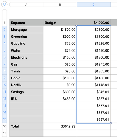 Когда вы отпустите его, Numbers вычтет каждый элемент вашего бюджета из вашей первоначальной кучи денег. Вы можете наблюдать, как эта цифра уменьшается, когда вы идете вниз по списку. Все, что осталось внизу, — это ваш бюджет на располагаемый доход.