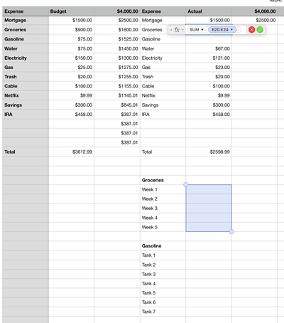 Все сделано? Вернитесь к пустым местам, которые вы оставили для газа и продуктов в столбце E. Выберите ячейку для продуктов, затем введите = SUM, затем выберите все ячейки в столбце E рядом с вашими пятью недельными покупками и нажмите Return.