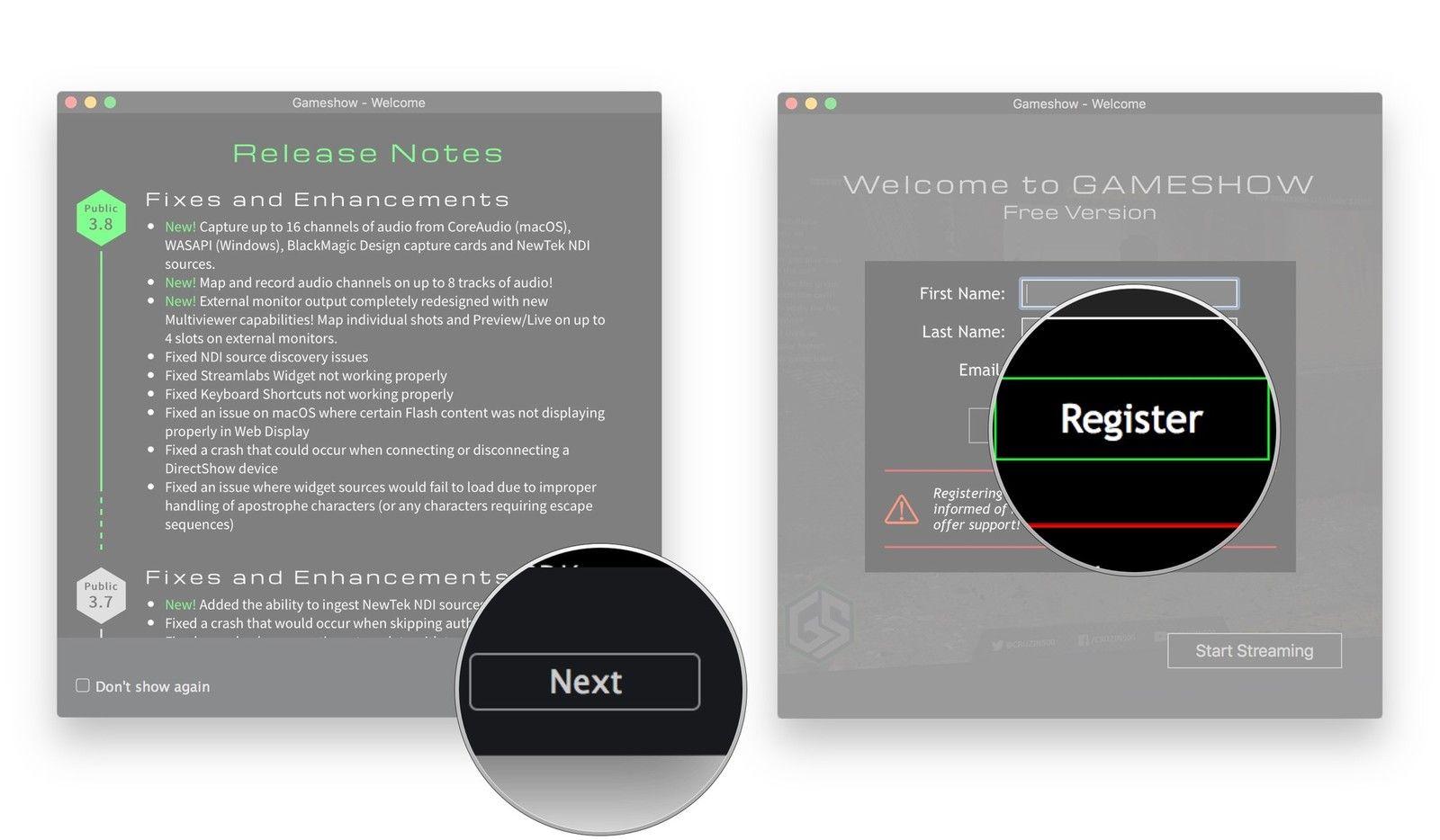 При желании выберите регистр или же Пропускать регистрация GameShow.