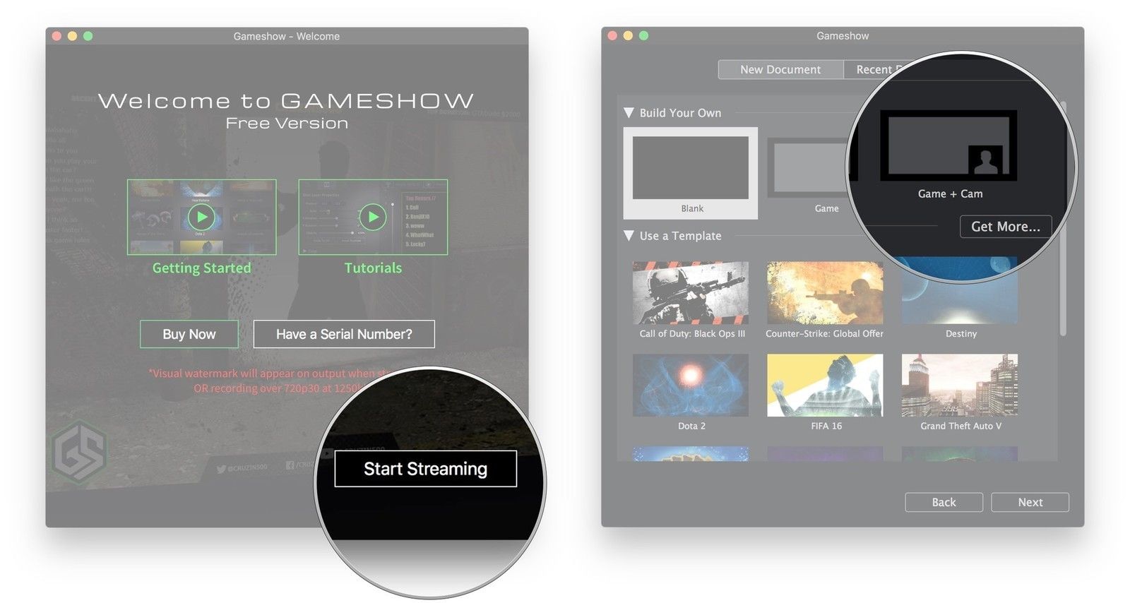 GameShow от Telestream предоставляет пользователям MacOS и ПК мощное, но простое в настройке потоковое программное обеспечение для начинающего игрового стримера. Он имеет уже настроенные шаблоны установленных игр, так что вы можете начать потоковую передачу как можно быстрее, или вы можете создать свой собственный шаблон с нуля. Это бесплатная загрузка, которая ставит водяной знак в видеопотоке во время трансляции или при записи видео с разрешением 720p. Или вы можете совершить разумную разовую покупку всего за 29 долларов, чтобы избавиться от этих минимальных ограничений. Абсолютно стоит, если вы спросите меня.