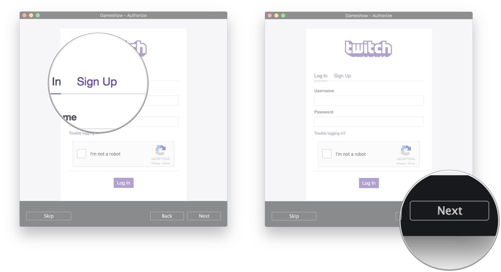 - Теперь вас попросят Авторизоваться или же Зарегистрироваться для Twitch. Вы можете создать новую учетную запись в приложении Gameshow.