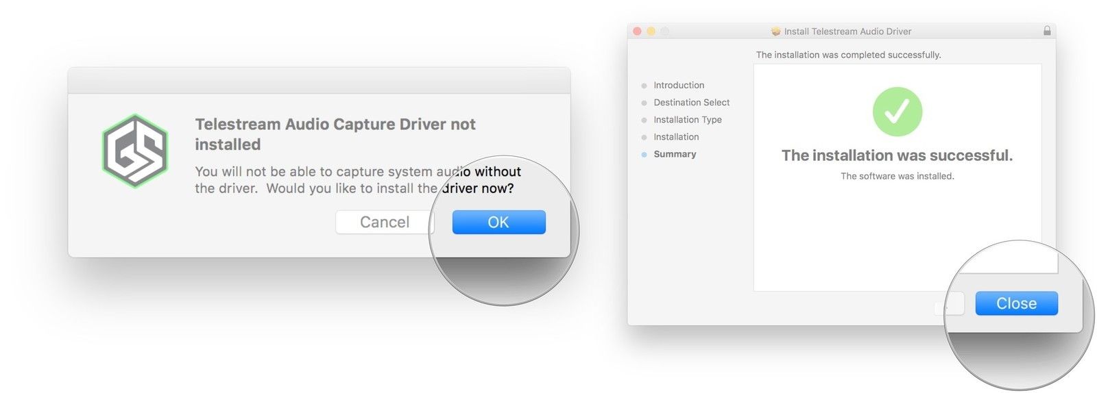 - Вам будет предложено установить Драйвер захвата звука Telestream. Нажмите Хорошо.