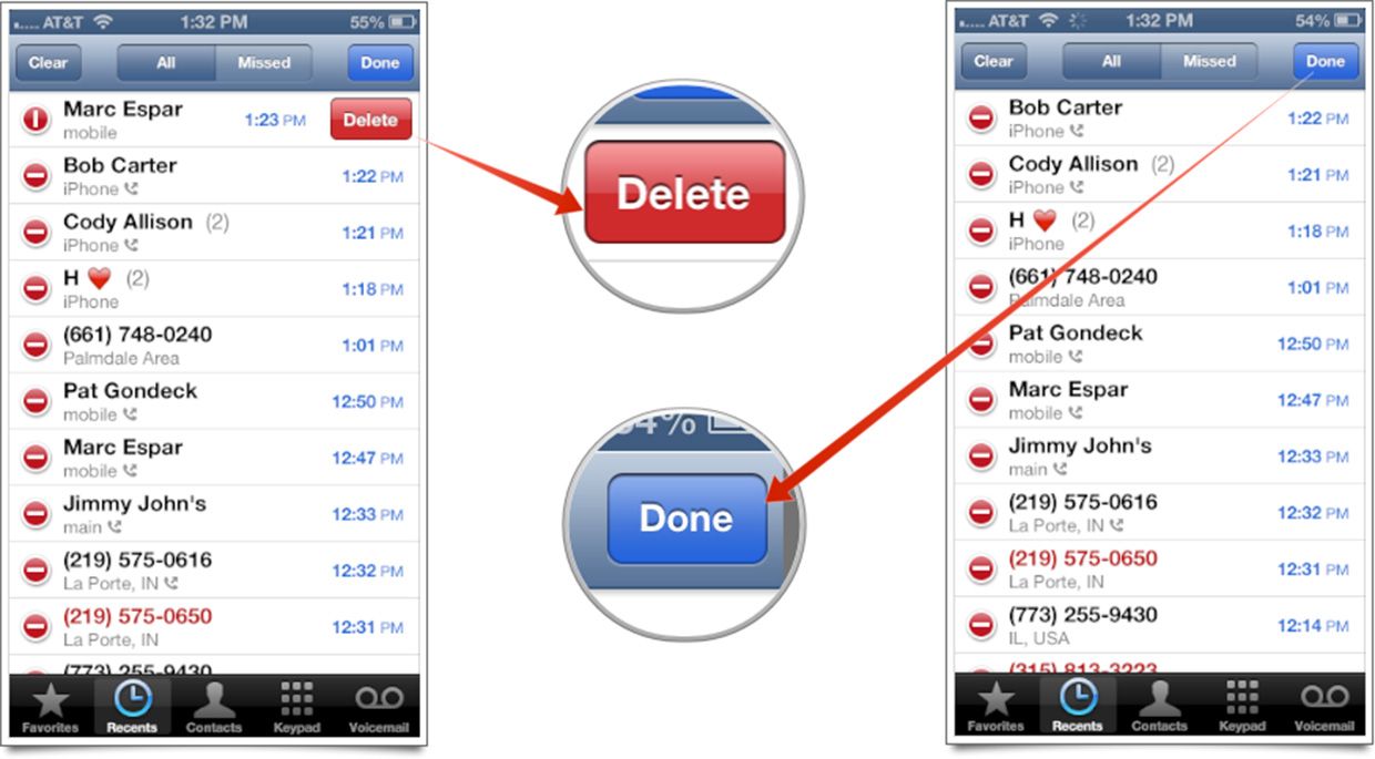 - Повторите этот процесс для вызовов, которые вы хотите удалить, и, как только вы закончите, нажмите на Готово опция в верхнем правом углу экрана.