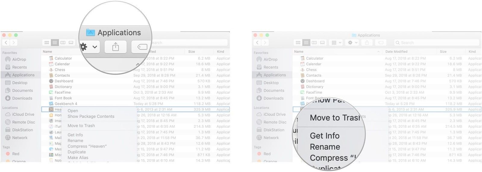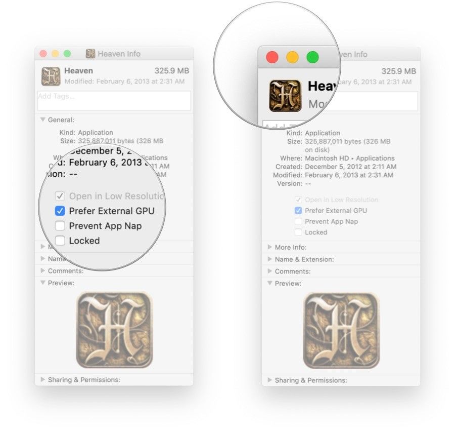 Запишите место установки приложения, которое вы хотите установить, чтобы предпочитать eGPU. Интуитивно, Apple решила, что вместо использования панели предпочтений в Системных настройках для централизованного администрирования, вместо этого вам нужно использовать Finder, чтобы перейти к установленному приложению и внести изменения в Получить данные вариант.