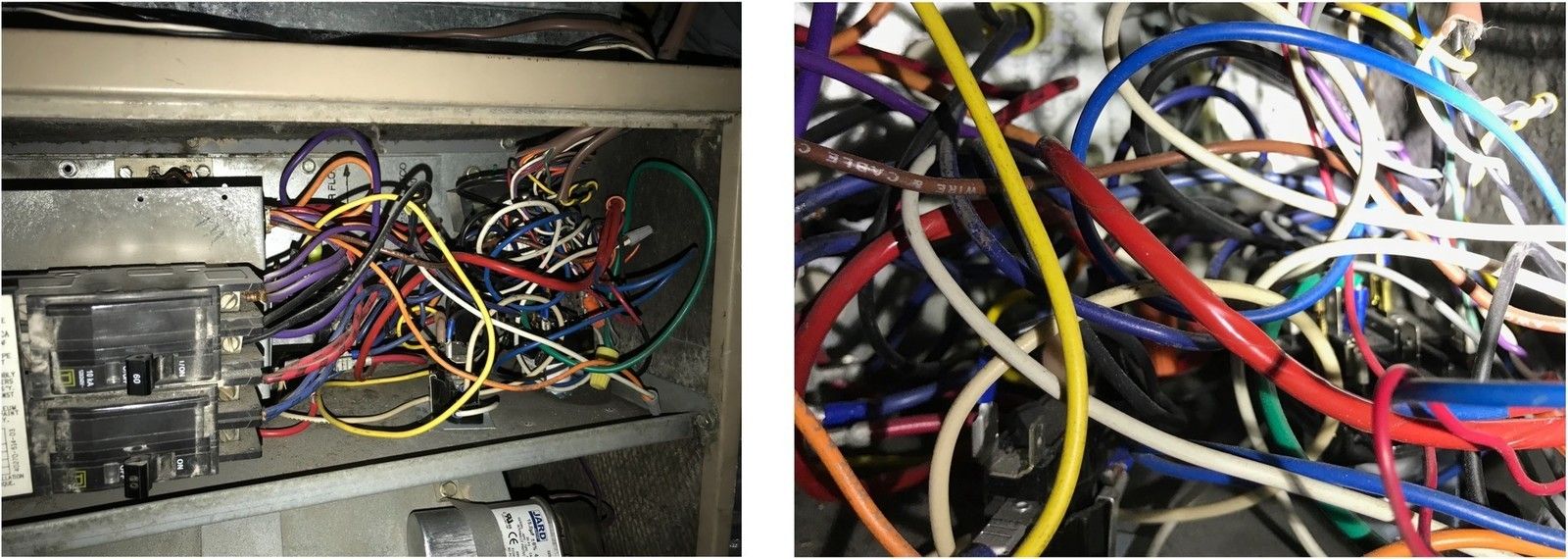 Моим следующим очевидным шагом было установить PEK, предоставленный ecobee. Итак, я пошел в топочную, открыл боковой люк печи, чтобы получить доступ к внутренностям, и был встречен этим кошмаром: