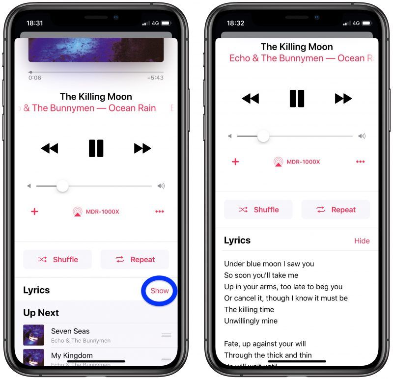 - Вы должны увидеть тексты песен, перечисленные непосредственно над функцией Up Next для песен, в которых есть тексты песен. Нажмите Шоу наряду с этим, чтобы раскрыть текст песни.