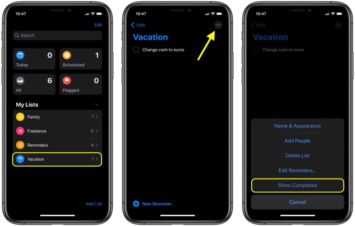 Apple, похоже, выбрала это поведение по умолчанию, чтобы сосредоточиться на напоминаниях, которые все еще должны быть выполнены. Однако иногда бывает полезно следить за тем, чего вы уже достигли в списке. Просмотр задач, которые вы выполнили, также может дать вам поддержку и мотивацию, когда вы работаете над проектом.