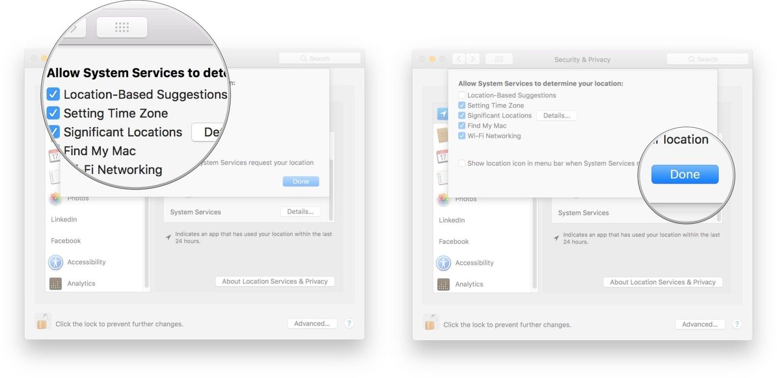 Нажмите Готово Когда вы закончите, чтобы завершить включение / выключение услуг определения местоположения.