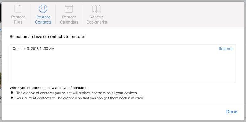 Apple регулярно архивирует список контактов, которые могут быть восстановлены на устройстве iOS в любое время. Восстановление списка контактов из архива приведет к замене контактов на всех устройствах iOS, подключенных к вашей учетной записи «iCloud», при этом архивируя текущий список контактов, убедитесь, что ничего не потеряно. Контакты не могут быть восстановлены один за другим — это пакетная операция «все или ничего».