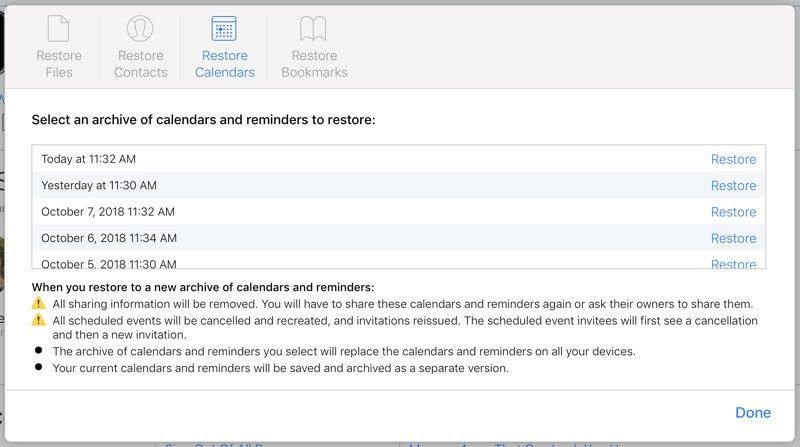 Восстановление Календаря удалит всю информацию об обмене, поэтому Календари и Напоминания, которыми поделились друзья и семья, должны будут снова делиться. Все запланированные мероприятия также будут отменены и созданы заново, переиздав все приглашения на мероприятия.