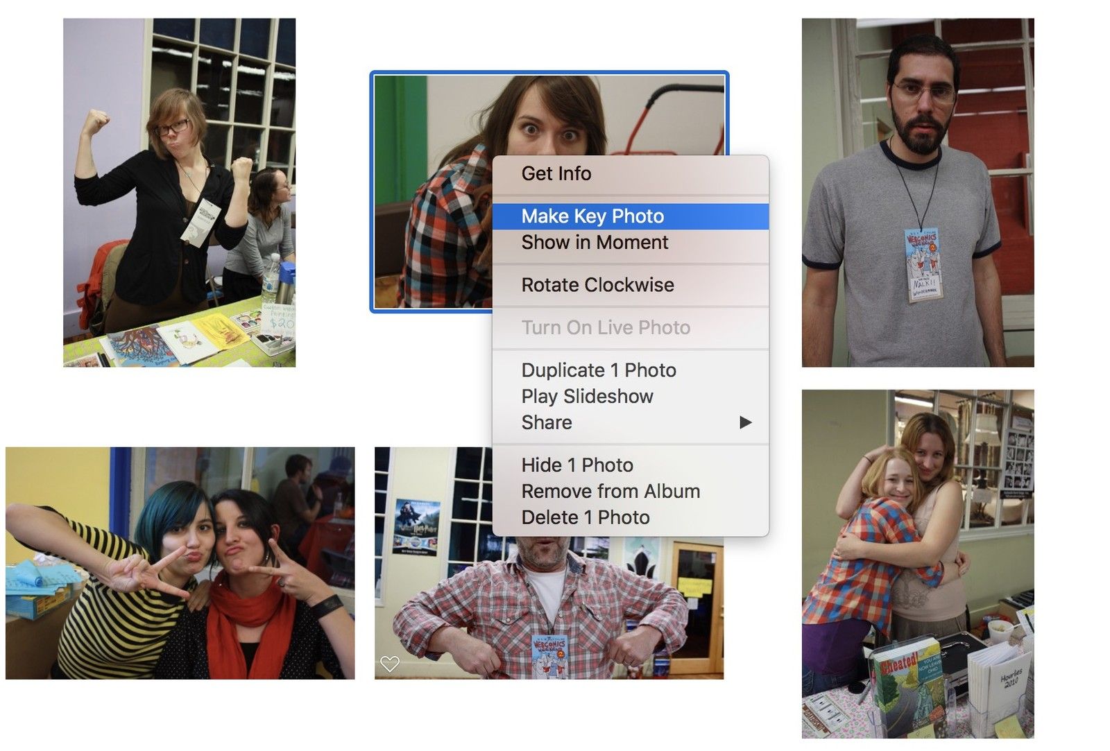 Самым утомительным является то, что у Apple есть версия этой функции для альбомов на Mac: щелкните правой кнопкой мыши (или удерживая нажатой клавишу Control) любую фотографию в альбоме, и вы получите раскрывающийся список с опцией Сделать ключевую фотографию. (iOS, к сожалению, никогда не мог этого сделать.) Но то же самое не относится к Memories.