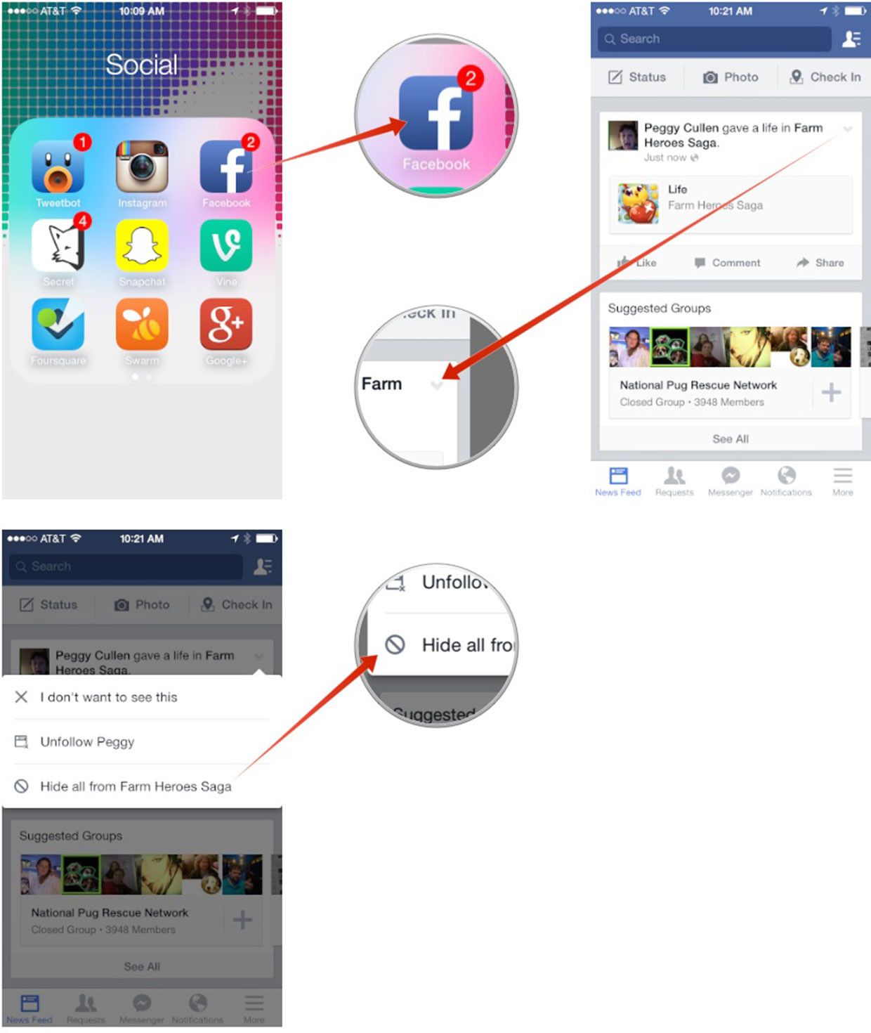 - В своей основной ленте новостей, когда вы сталкиваетесь с приложением или игрой, вы получаете уведомления, которые вы не хотите видеть, нажмите символ карат в правом верхнем углу поста.