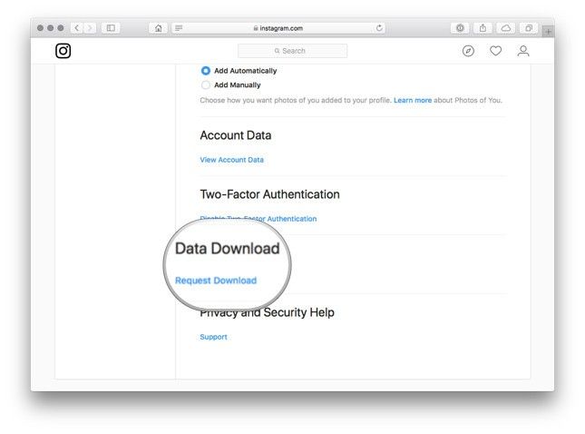 Прокрутите вниз, пока не увидите Загрузка данных. Нажмите на Запрос на скачивание.