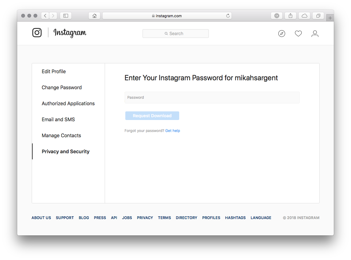 Введите свой пароль в Instagram. Затем нажмите Запрос на скачивание.