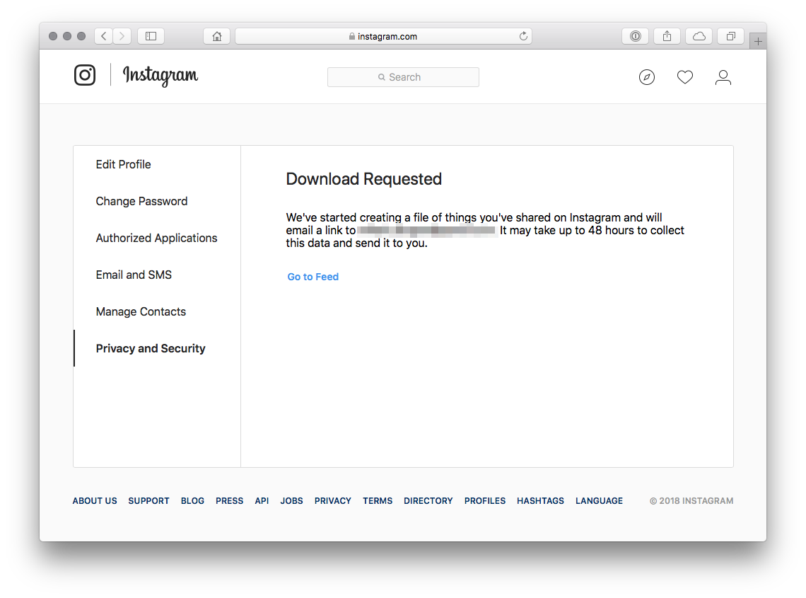 Вуаля! Instagram начнет создавать файл ваших данных, которые они затем отправят вам по электронной почте. Обратите внимание, что это может занять до двух дней, в зависимости от того, сколько вы поделились на своем аккаунте.