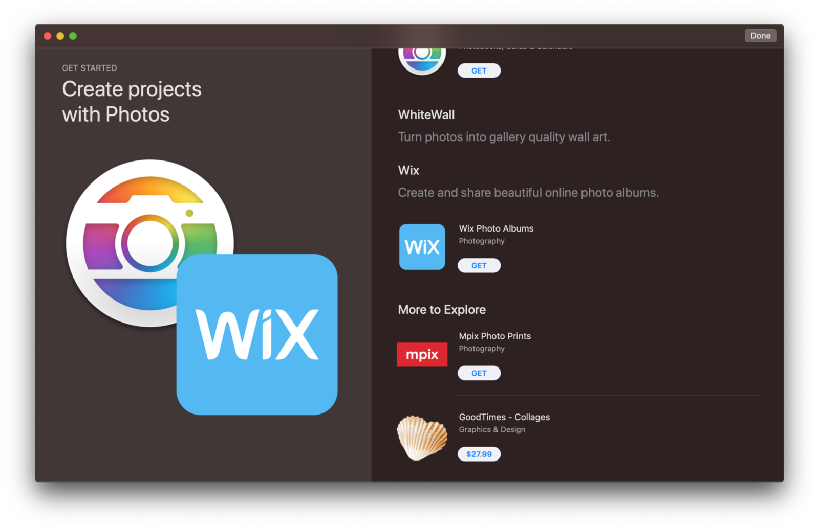 Как клиент Apple Print Services, мы хотели, чтобы вы знали, что эти услуги заменяются Фотографии проекта Расширения. С помощью Project Extensions вы можете легко настроить приложение Photos с новыми функциями от разработчиков. Project Extensions позволяет создавать высококачественные книги, открытки и календари, как вы это делали со встроенными службами. Вы можете конвертировать, редактировать и перепечатывать ваши существующие проекты, используя Project Extensions от Motif и Mimeo Photos. И вы найдете дополнительные предложения для новых продуктов, таких как печать в рамке, фото-холсты и многое другое.