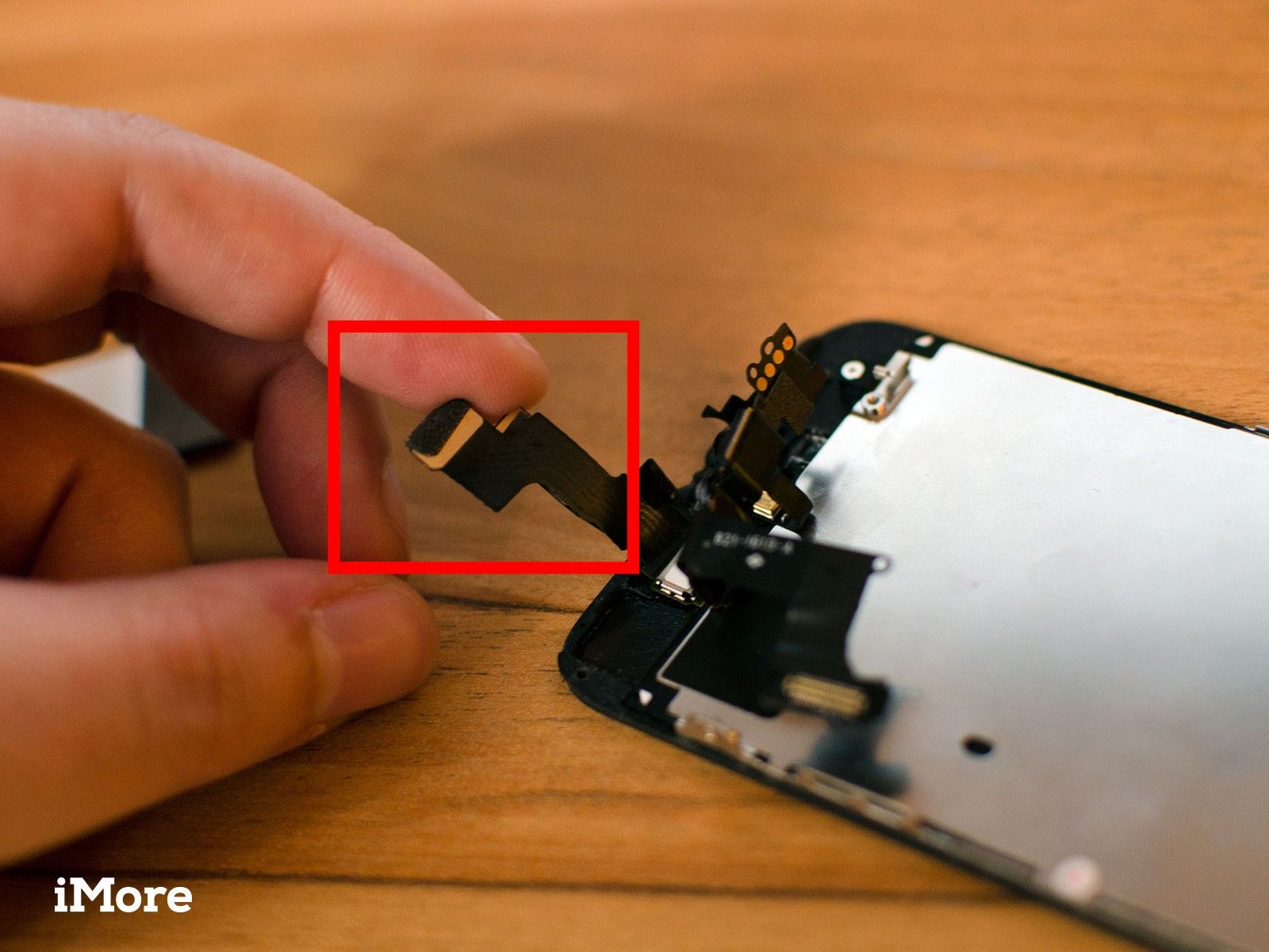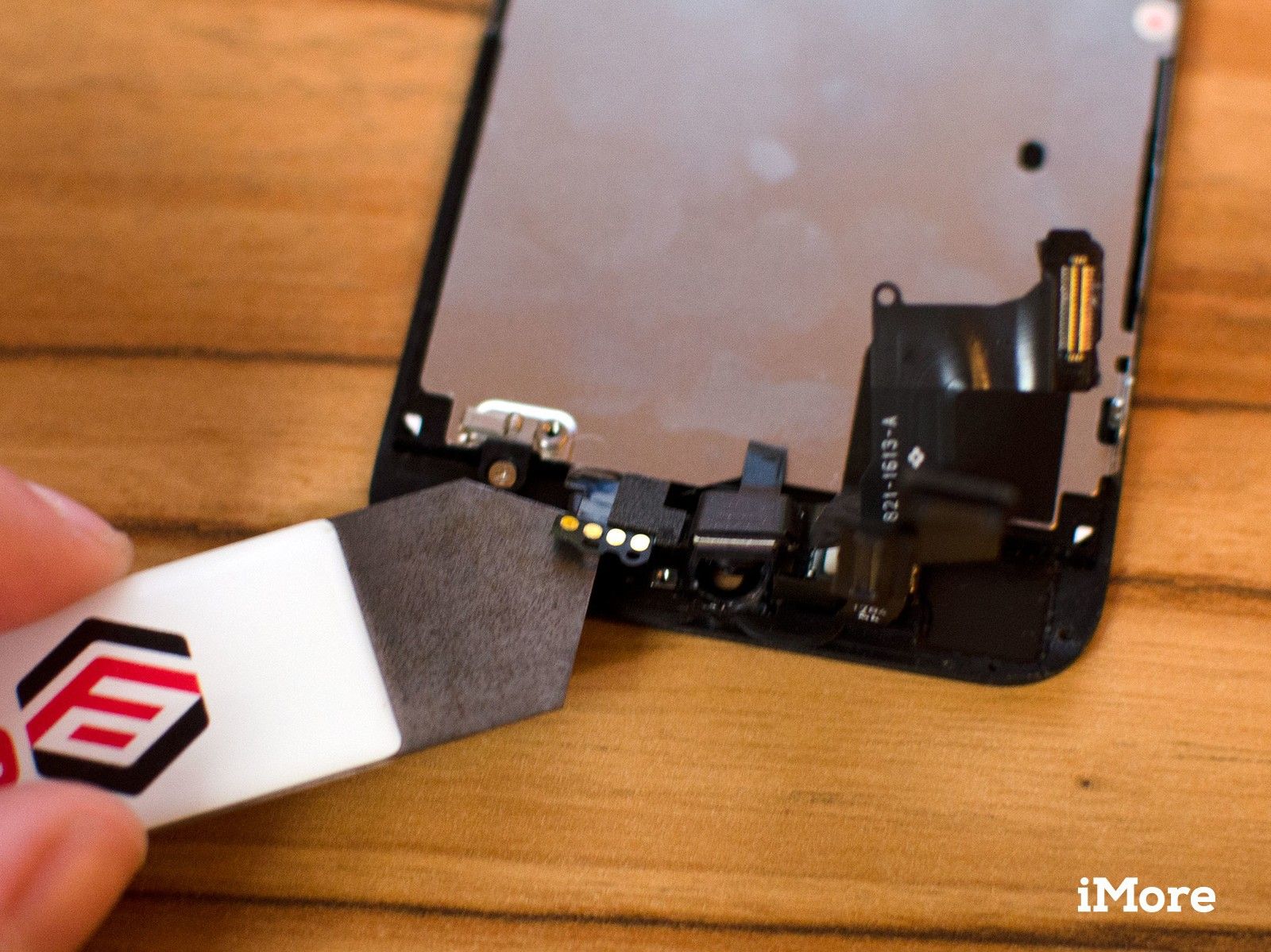 Если дисплей не хочет возвращаться вниз, НЕ форсируйте его. Вместо этого убедитесь, что верх выстроен правильно, и что вы не цепляете за кабели. Не должно быть никакого сопротивления, когда он снова встанет на место. Если есть, вы неправильно выстраиваете это. Также убедитесь, что наушник установлен правильно. Если он не полностью заполнен, это может привести к тому, что сборка не будет лежать на корпусе вашего iPhone 5s.