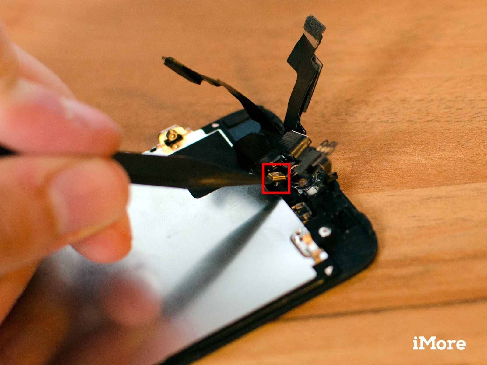 - Кабель камеры все еще прикреплен к моему микрофонному отверстию, поэтому приподнимите его, используя инструмент spudger как показано на фото ниже.