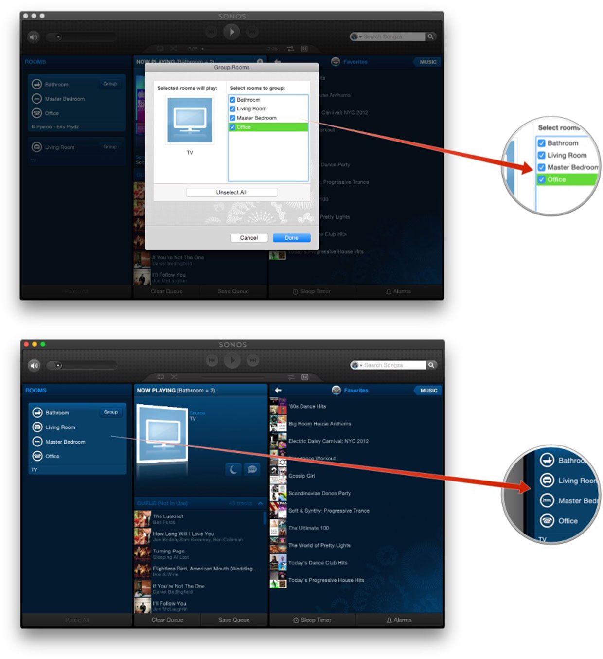 - Теперь запустите Приложение Sonos Controller на вашем Mac, iPhone или iPad и сгруппируйте колонки вместе с компонентом Sonos, который вы использовали в AirPlayed на шаге 3.
