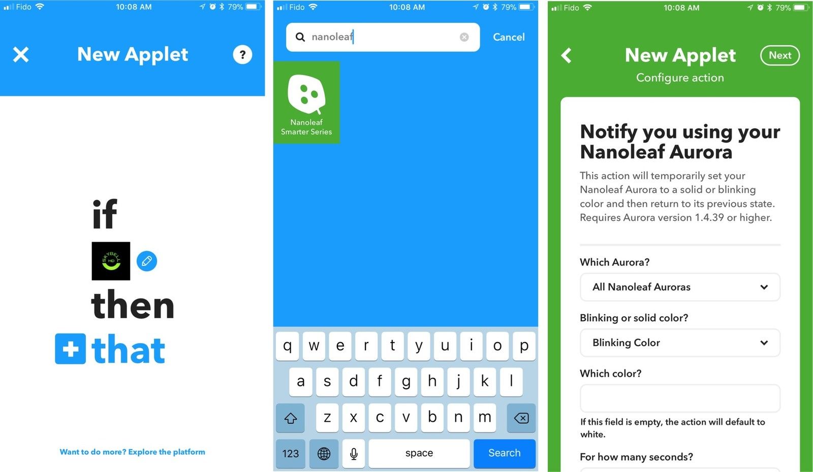 После того, как вы установили и настроили свои устройства, мы можем представить эти устройства в приложении IFTTT. Мы создадим новый рецепт, чтобы наш дверной звонок заставлял наши огни мигать определенным цветом, когда кто-то нажимает кнопку. Вы также можете сделать то же самое, когда датчик движения активирован.