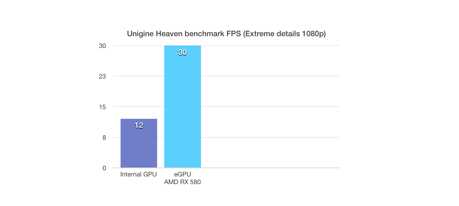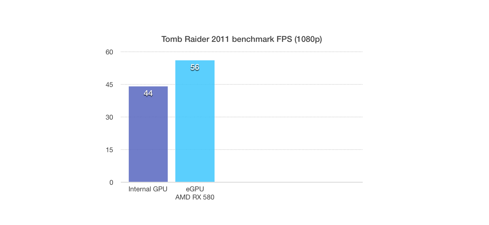 Здесь мы сравниваем внутренний графический процессор Mac с RX 580 внутри eGPU. Я использую более старый Tomb Raider с 2011 года, чтобы я мог запустить сопоставимый (не научный) тест для игры, которая работает как на Mac, так и на Windows (см. Ниже).
