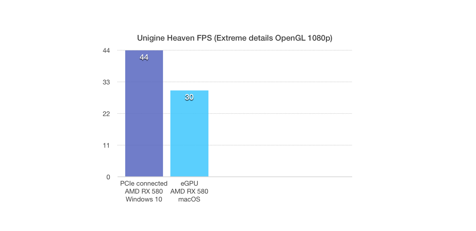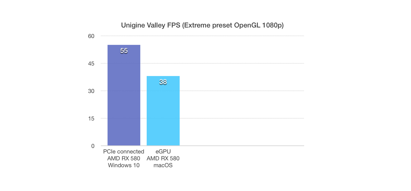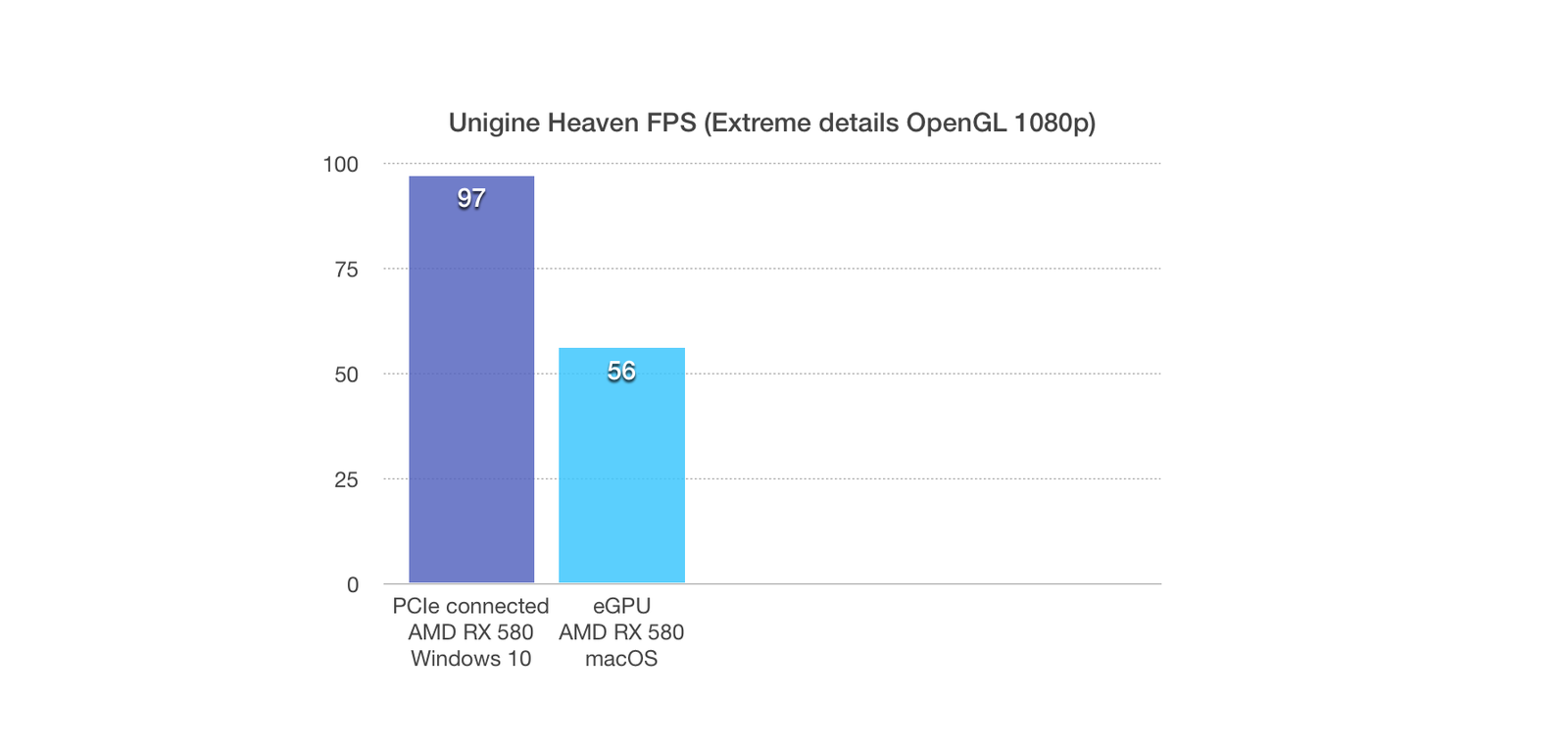 Хотя это не сравнение 1: 1, я решил сравнить RX 580 в eGPU на macOS High Sierra с той же картой, установленной на моем компьютере с Windows 10 через порт PCIe. MacBook Pro, который я использую, имеет процессор Skylake i7, работающий на частоте 2,6 ГГц. ПК с Windows, который я использую, также имеет процессор Skylake i7 (6700k), но он работает на частоте 4 ГГц. Хотя это несправедливое сравнение с точки зрения ЦП, эти тесты не сильно нагружают ЦП, и поэтому влияние более слабого ЦП MacBook Pro, вероятно, минимально. Я хотел бы сделать сравнение через bootcamp, но eGPU не поддерживается в этой среде.