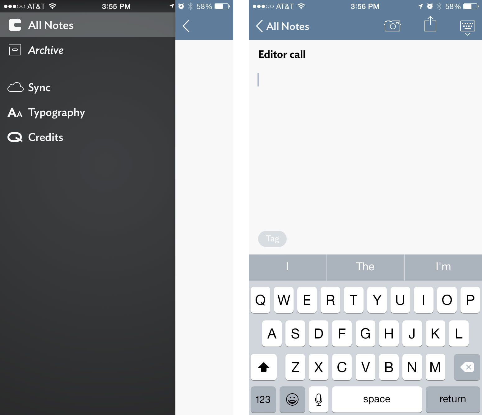 Vesper также является приложением для заметок, доступным для iPhone, но имеет гораздо более простой интерфейс, чем компьютеры, такие как Evernote. Запустите Vesper, начните печатать, добавьте несколько тегов и все готово. Он уже оптимизирован для использования на iPhone 6 и 6 Plus, так что вы можете увидеть еще больше на экране. И, как всегда, ваш текст находится впереди и в центре, а остальная часть приложения просто тает.